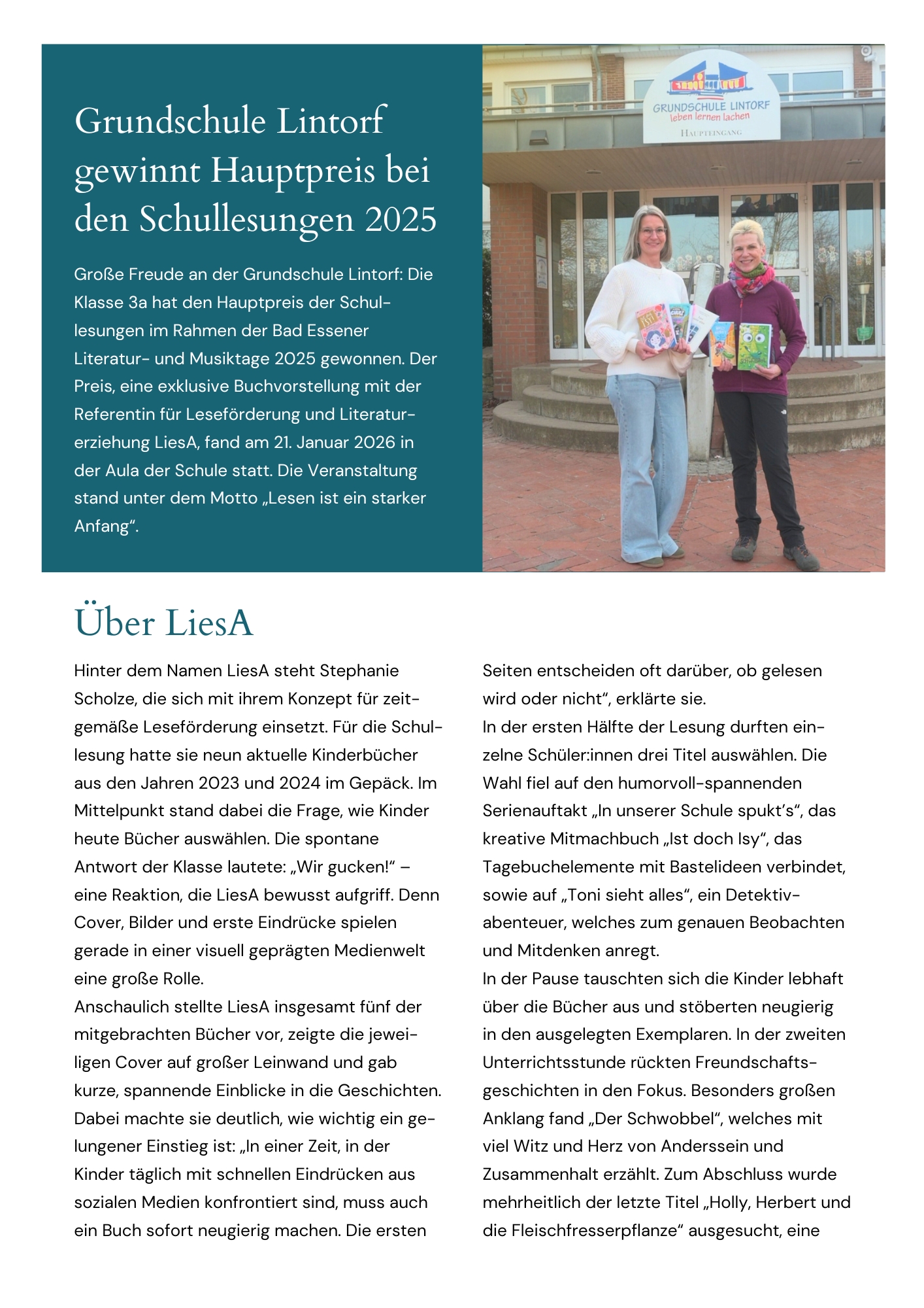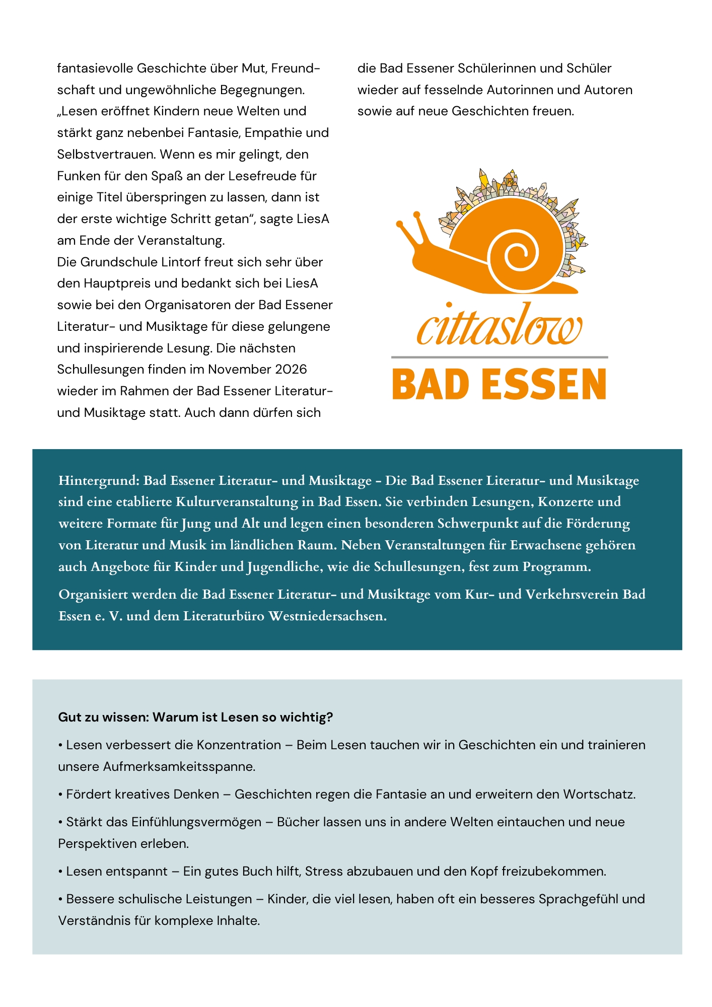 Pressemitteilung der Tourist-Information Bad Essen vom 27.01.2026. Auch nachzulesen hier: Hauptpreis geht an Grundschule Lintorf – Tourist-Info Bad Essen
